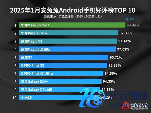 快科技2月7日音书开云kaiyun.com,安兔兔公布了2025年1月安卓手机好评榜单,华为Mate70 Pro+以99.99%的好评率夺冠。